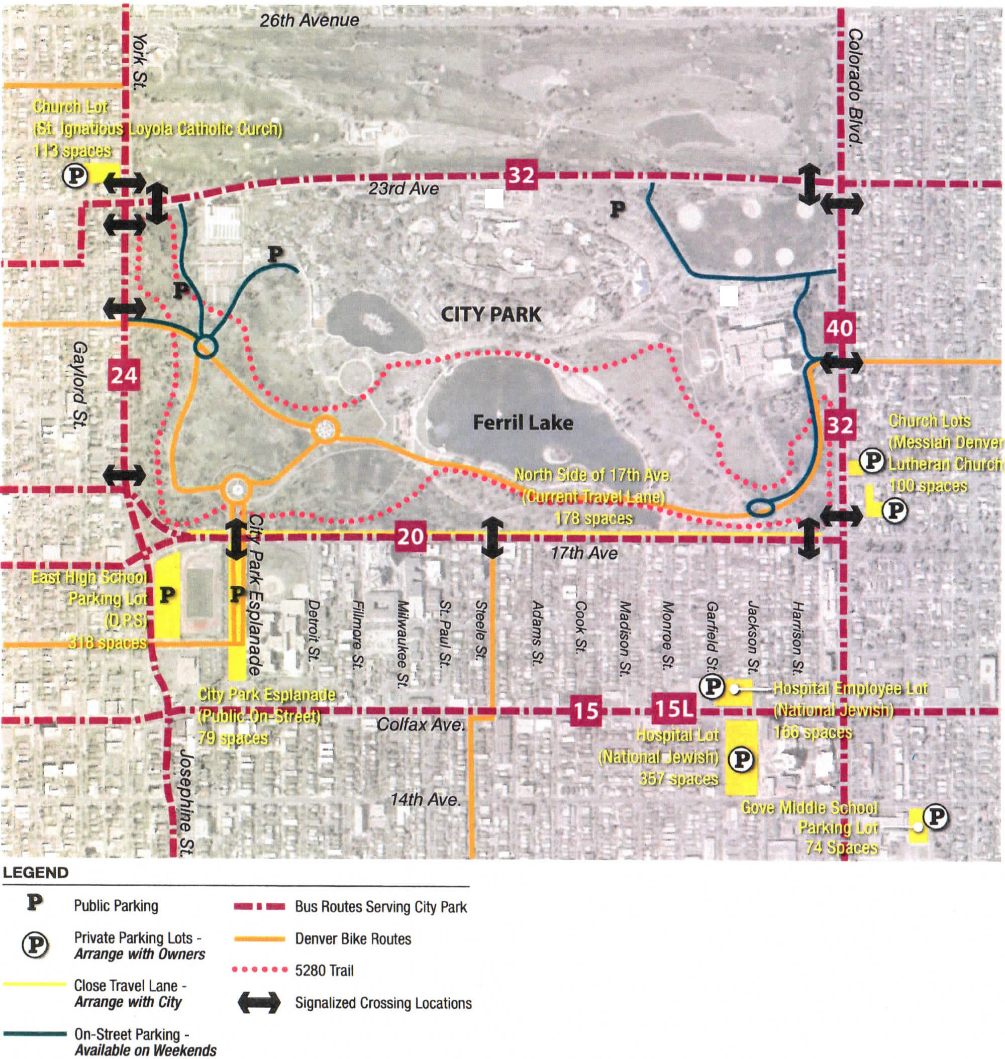 There are numerous parking lots surrounding City Park. Please click here for the locations of these lots. The two largest parking lots in the general vicinity of City Park are at the East High School track and at the National Jewish Center visitor lot. Parking may also be available in the lots between the Denver Zoo and the Denver Museum of Nature and Science. Please do not park in the lot or garage directly in front of the Museum. The parking lots at Gove Middle School and Manual High School can also be used. Parking is also available on the neighborhood streets surrounding City Park.